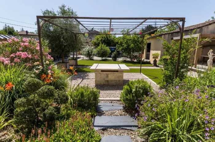 Une pergola centrale surplombe un puits condamné et une table en travertin sur-mesure et assortie au dallage, a été installée sur le puits.